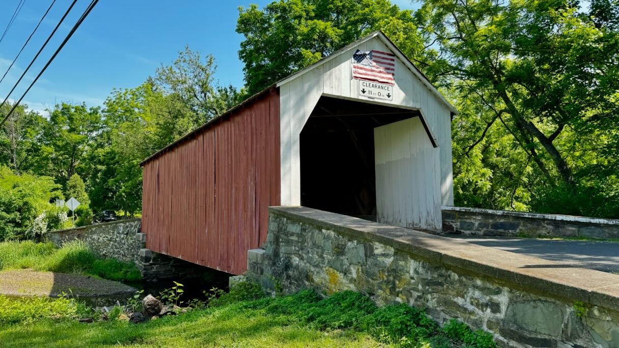 Bucks County's shortest covered bridge at only 56-feet long, the Erwinna Covered Bridge is noted for its lattice-type construction and stands as part of a tract of 528 acres purchased by Colonel Arthur Erwin in 1769. Erwin served in the Bucks County militia and rallied militia to take part in the 1776 Crossing. It was built in the mid-1850s.